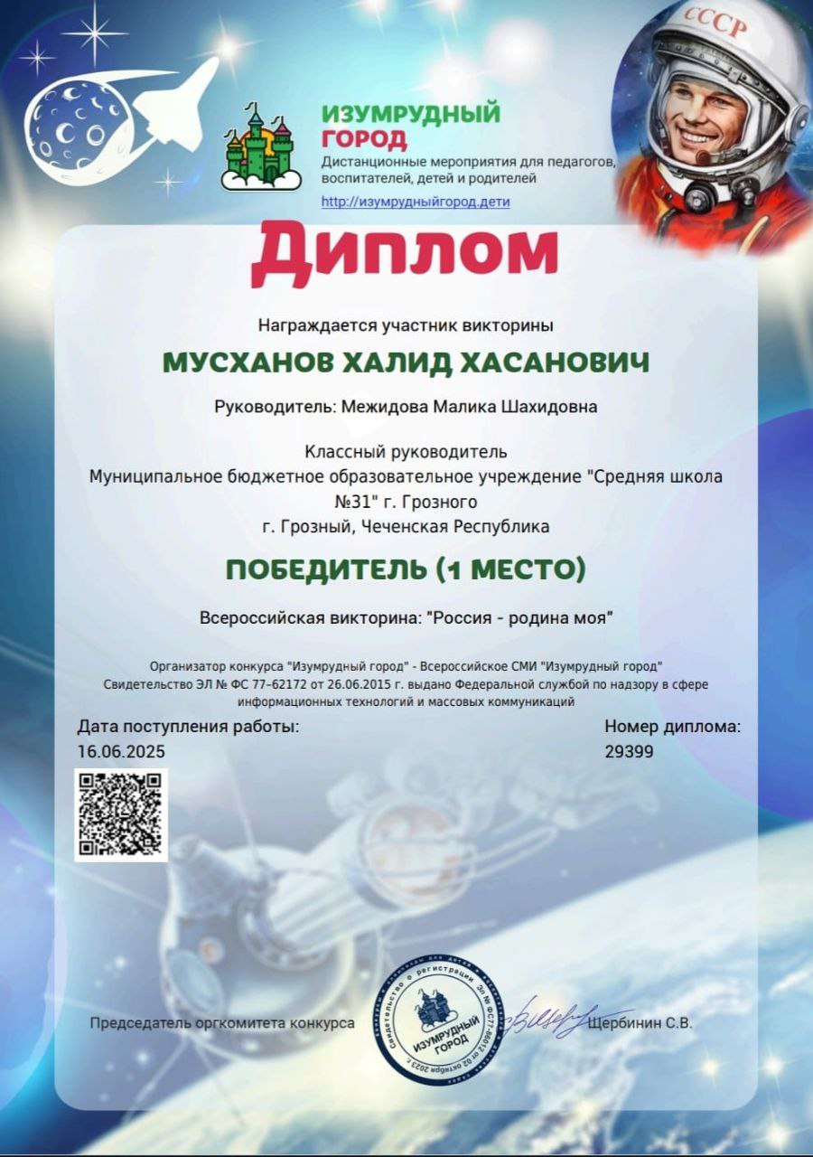 Ученик 5 «а» класса средней школы № 31 г. Грозного Мусханов Халид занял первое место во Всероссийской викторине «Россия – Родина моя», которая проводилась на портале «Изумрудный город». Мероприятия сайта имеют Международный или Всероссийский уровень Классный руководитель 5 «а» класса Межидова Малика Шахидовна отметила, что в течение учебного года Мусханов Халид активно принимал участие во всех мероприятиях, но в мероприятии данного уровня участвовал впервые и показал отличные знания в области истории, что очень радует.